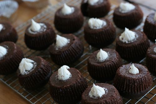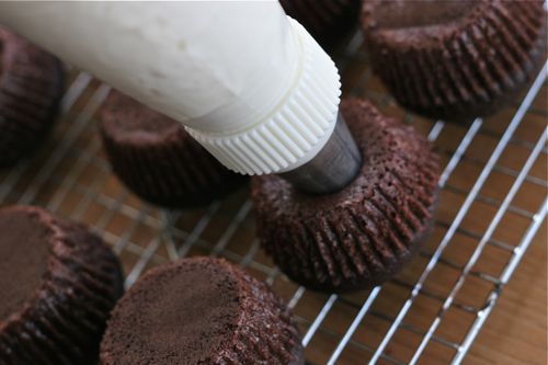The question everyone asks is… how do you get the frosting inside? Once the cupcakes have cooled, you can make the frosting and put it into a large pastry bag with a big star tip. Turn the cupcakes upside down, shove the star tip into their behinds, and squeeze. The cupcake has some air pockets in it, so there is a surprising amount of space for the frosting. You will be able to feel when it’s “full” and the tip will sort of pop out.