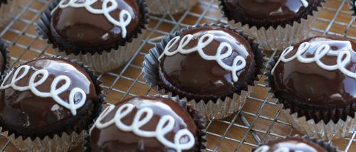 Once you’ve filled them all, you can pass over with a knife to clean up any excess icing. To put the glaze on, I take the filled cupcakes and gently swirl them in the warm chocolate glaze. You have to use the glaze at about 100 degrees F or it won’t set properly. Since 100 degrees is just above body temperature, there is an easy way to test for 100F without a thermometer. Dab a little glaze in the indentation that’s just below the middle of your lower lip (a very sensitive part of the body that interprets temperature well.) The glaze should feel just slightly warm but not too hot.