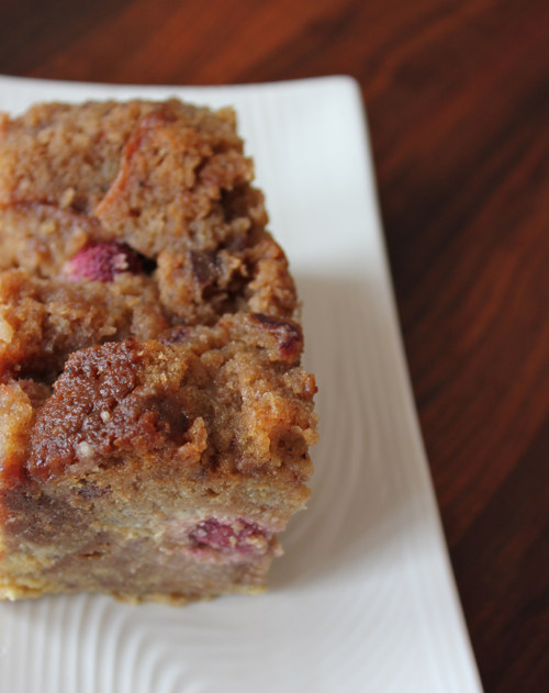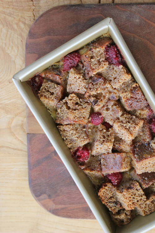 This particular pan was made out of half of a stale Kentucky Jam Cake (I scraped the frosting off before cubing) because I couldn’t eat a whole cake by myself fast enough. I added the remains of a pint of mushy, overripe raspberries which baked up juicy and sweet.
