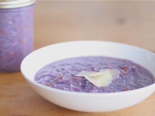 There are so many things that are beautiful about this soup – like how easy it is to make, how many nutritious ingredients it packs in, how few calories it has… but the number one beautiful thing is the color! ShaZAM! That’s a gorgeous shade of lavender to be eating, flecked with touches of appropriately contrasting orange. Get your Pantone books and tell me what shade that is so I can paint my living room that color!