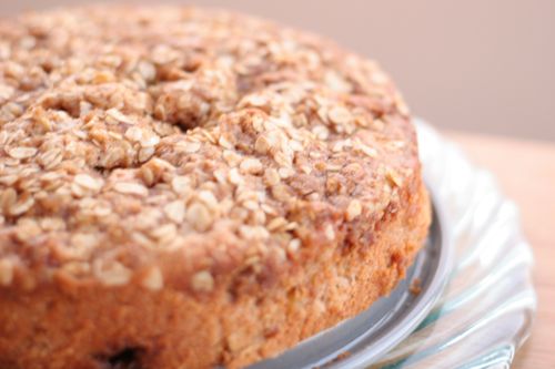 • Make the topping: Using your hands or a pastry blender, combine oats, brown sugar, small pieces of butter, and salt in a bowl until the butter is about the size of lentils (some pieces can be flat and resemble the size and shape of  a cornflake.) Sprinkle evenly over the top of the batter.