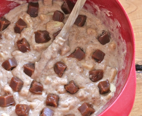 • Pour the liquid ingredients into the dry and mix with the wooden spoon just to combine. Add the apples and caramel pieces, making sure the caramels are not all stuck together.