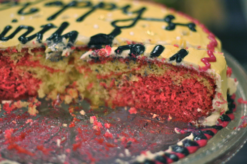 OK, so the outside looks good–it’s the INSIDE that’s the problem, and that was supposed to employ the aforementioned “simple technique” for the aforementioned “show-stopping stunner”. She requested vanilla cake with vanilla frosting, and noted that her favorite colors are gold, magenta, and black. This is a special girl so I wanted to make her a special cake! But it’s Sunday, so I didn’t want to spend the whole darn day on it. I had seen a chocolate and vanilla zebra cake on AZ Cookbook and loved the simple concept behind this cool-looking cake. To make a zebra cake, you chocolatize half the batter, and spoon small amounts of alternating batters into the center of the pan, where they fill in and make a stripey pattern. Easy, right? There’s a great tutorial on the AZ Cookbook site with photos. Of course, once you decorate the cake, no one suspects the excitement inside.