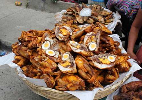 We arrived early, around 9:30 in the morning, and parked a couple miles from the graveyard. We meandered through town and stopped to explore all of the special foods and flowers on sale for this special day, like half chickens cooked with eggs inside…