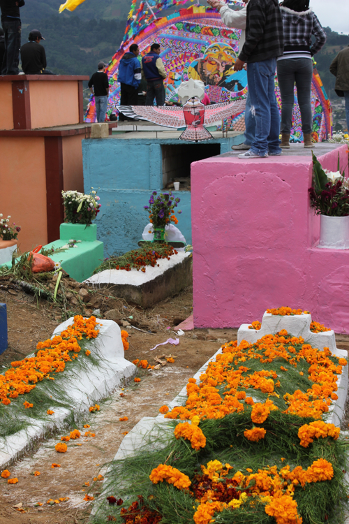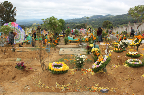 At the graveyard, we found that families come in the morning to repaint the graves of their loved ones in bright, bold colors. Then they decorate them with marigold blossoms and pine needles. Families were picknicking on the gravestones and mounds of their loved ones, as is the custom. Our guide assured us that stepping and sitting on the gravestones was OK and not disrespectful in Guatemalan culture.