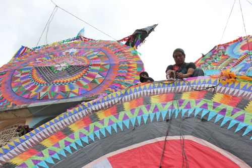 As the day wore on, more and more people came to see the kites, large and small. The huge kites were all carefully, gingerly, and slowly raised to full height, using a system of giant wooden poles (essentially, stripped tree trunks) and wires.