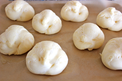 - The night before, prepare a pan with parchment paper and cooking spray and place the frozen croissants on it, well spaced. They will grow a lot! Leave out overnight to rise, 7-10 hours.