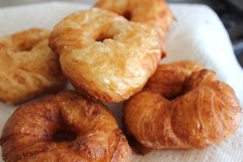 - Heat about 2 inches of oil in a heavy pot over high heat. When oil is shimmery, add a hole to test it. The croissant dough will cook and brown incredibly quickly if the oil is hot enough – literally 10 or 20 seconds to done.