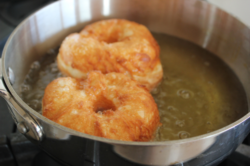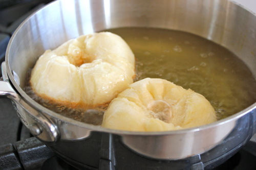 - When it’s hot enough, carefully lower the cronuts into the oil in batches. Don’t overcrowd the pan.